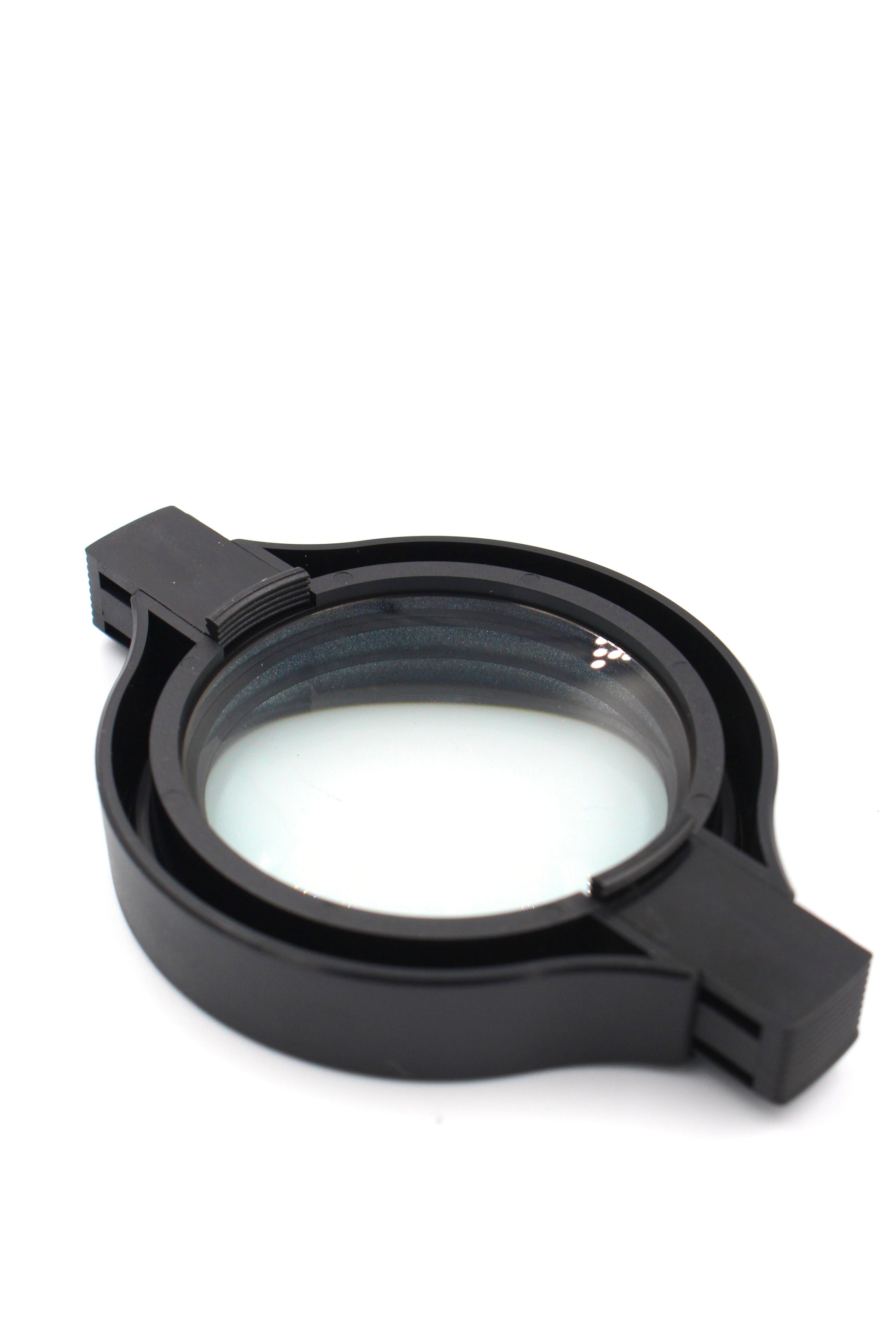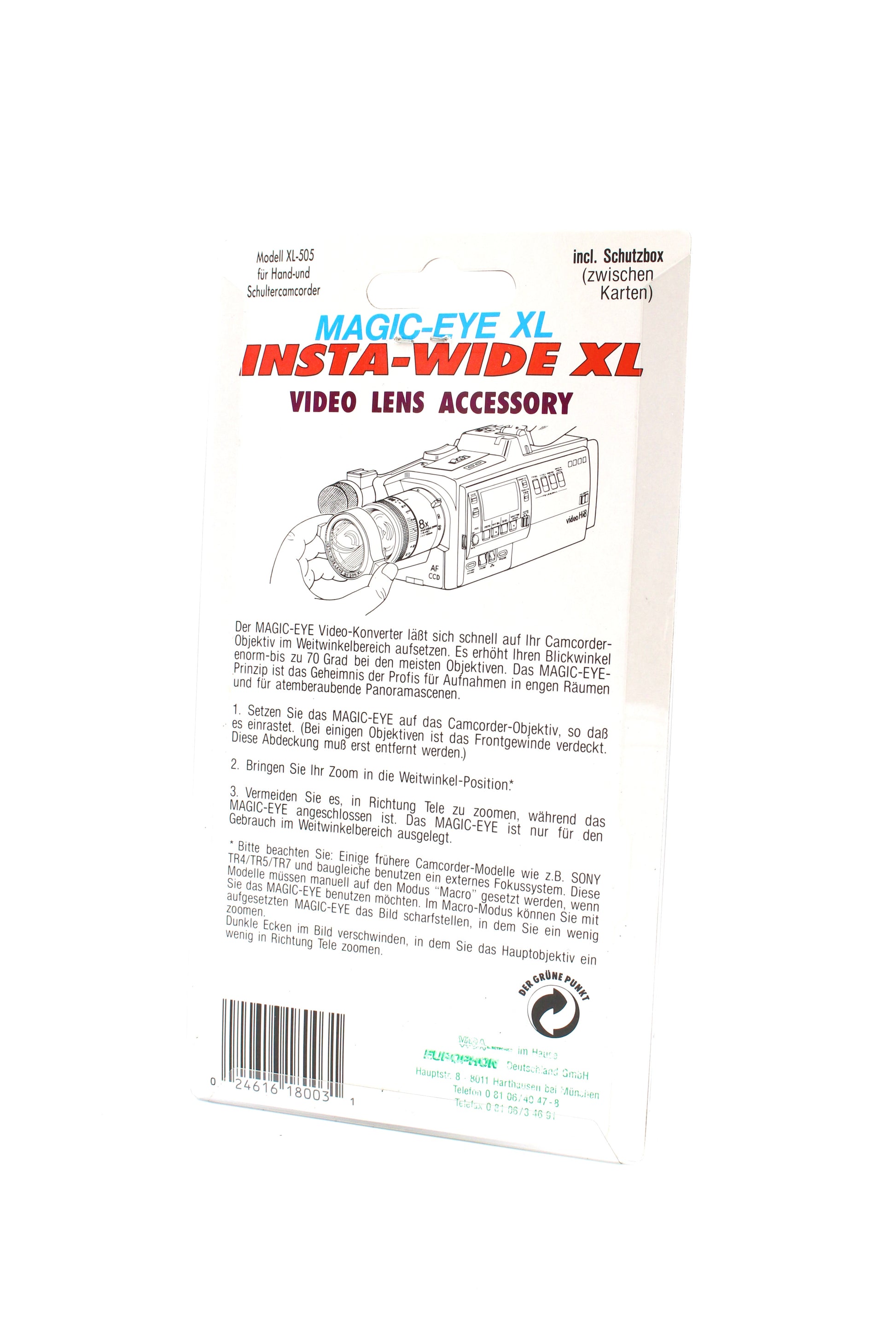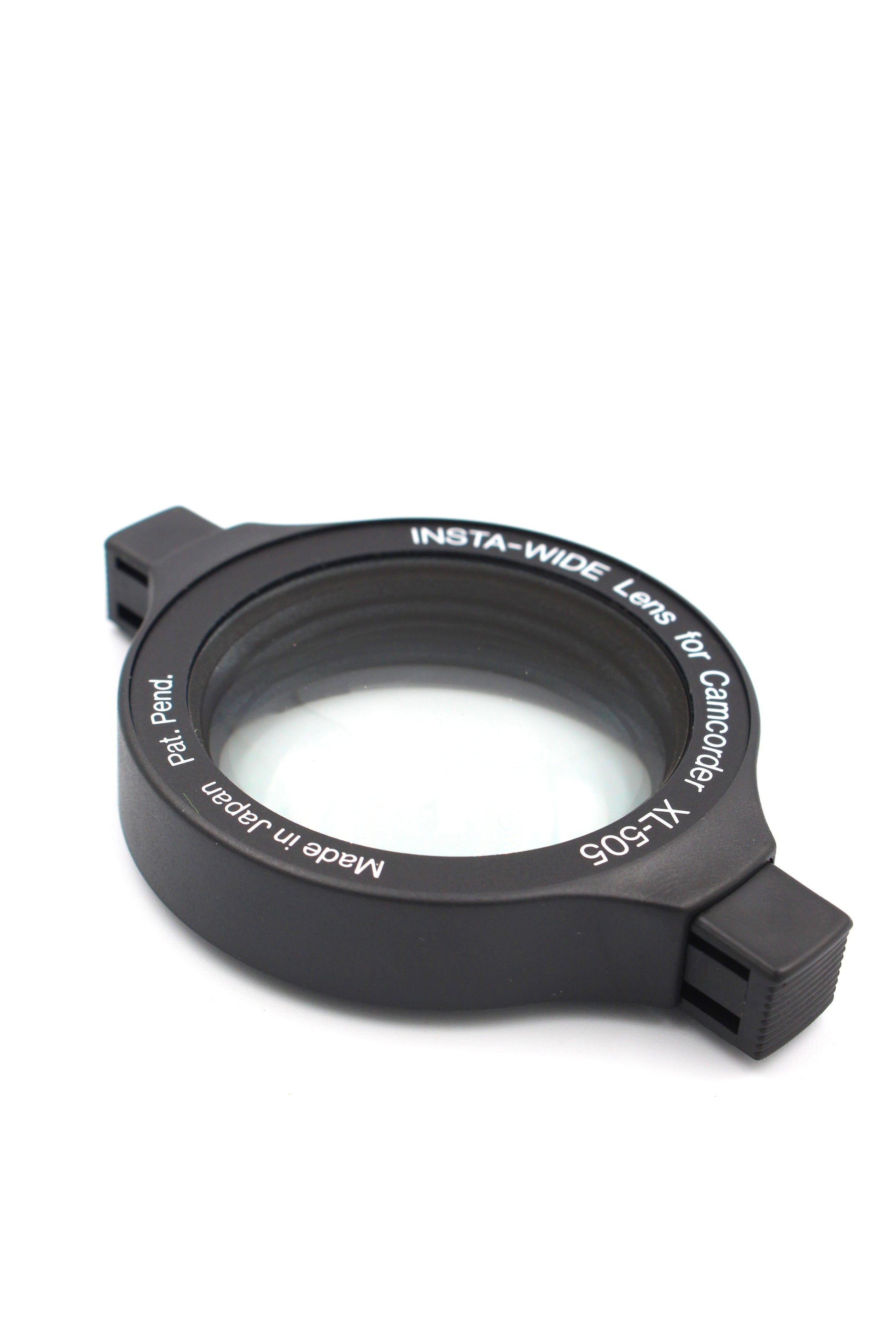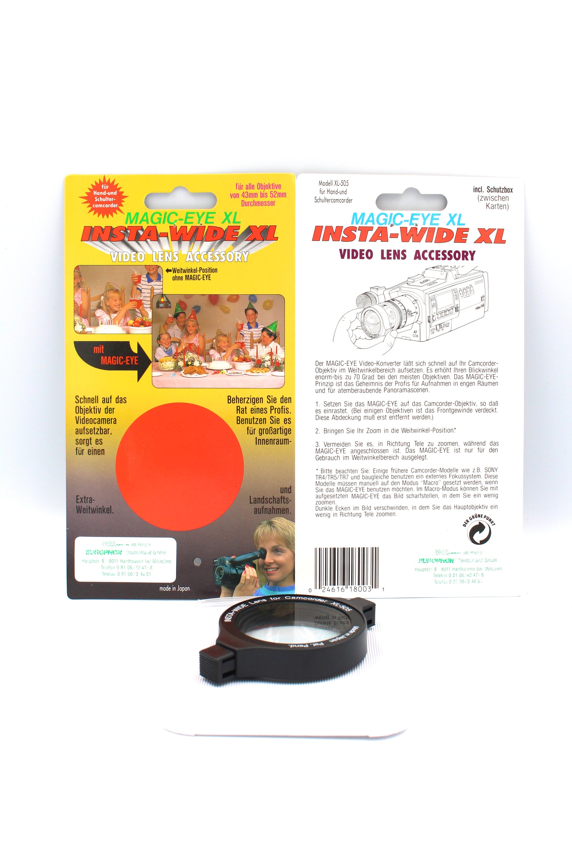The Magic-Eye Insta-Wide QC-505 is a clip-on wide-angle converter for video camcorders, offering a 0.5× magnification (half the focal length) and compatibility with filter thread sizes 43 mm and 52 mm.