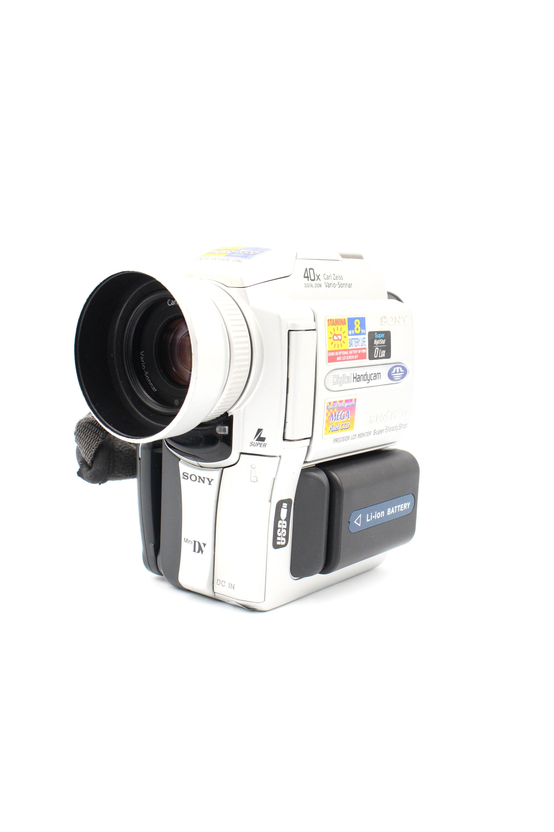 The Sony DCR-PC110E is a high-performance MiniDV camcorder that combines professional-quality video with a sleek, portable design. It features a Carl Zeiss Vario-Sonnar lens, 10x optical zoom, and a high-resolution 1/4" Megapixel CCD sensor for crisp video and detailed still photos. The 2" LCD touchscreen, Memory Stick slot, and i.LINK (FireWire) connectivity offer versatile recording and easy transfer options. With advanced features like Super NightShot and manual controls, the PC110E is ideal for enthusiasts and collectors seeking a premium vintage camcorder.