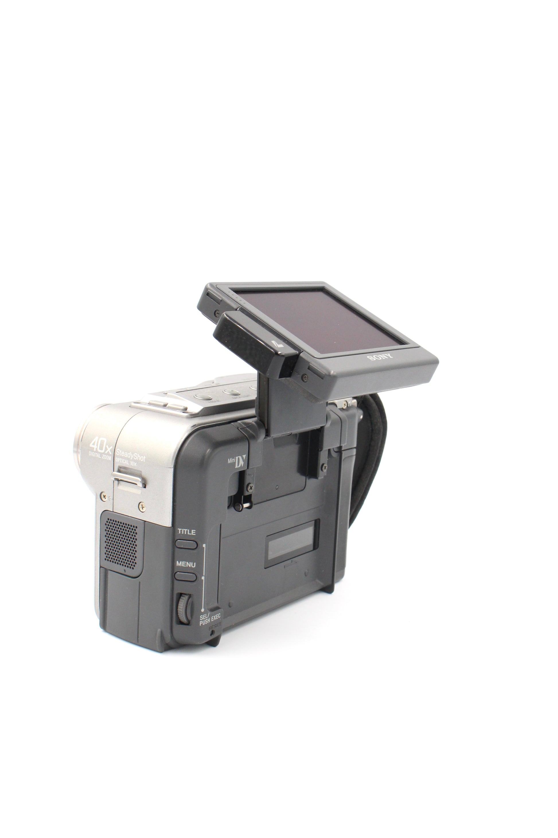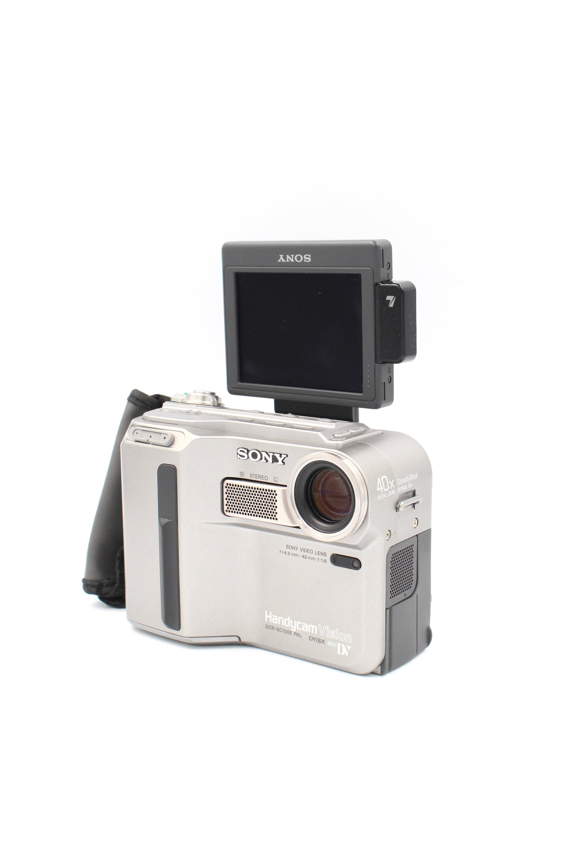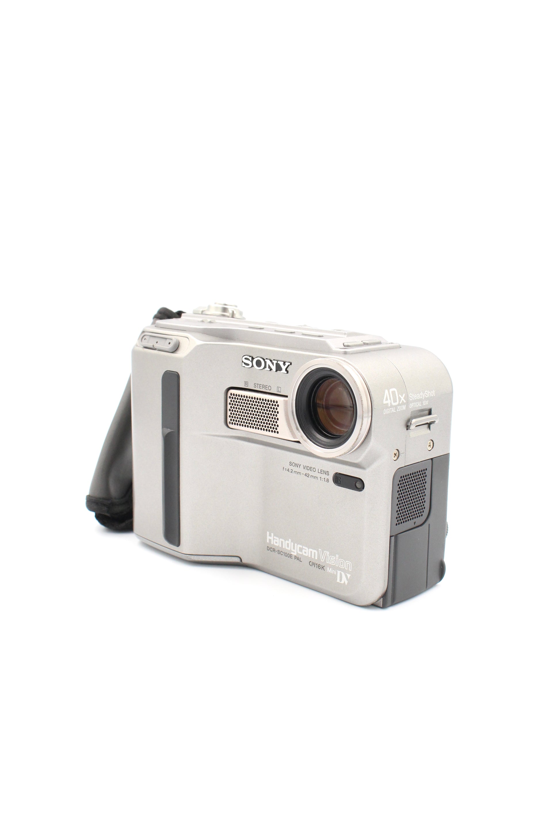 The Sony DCR-SC100E is a compact MiniDV Handycam that combines late-90s design with solid video performance. Featuring a 1:1.8 Sony video lens with a 10x optical zoom, stereo sound, and a flip-out LCD screen, it’s built for capturing crisp standard-definition footage on MiniDV tapes. Stylish and portable, the SC100E is perfect for anyone looking to relive that classic camcorder vibe with reliable Sony quality.